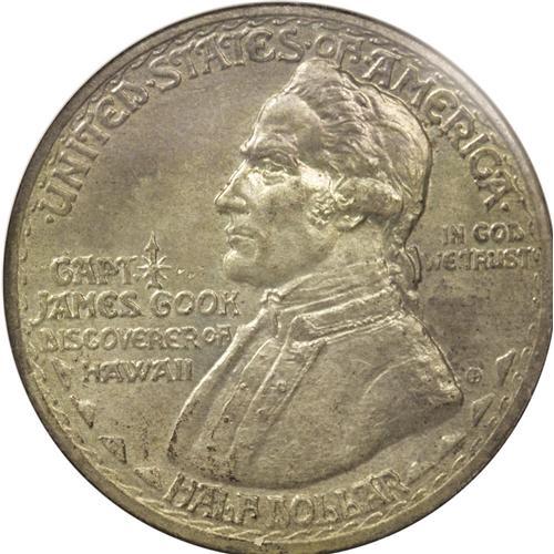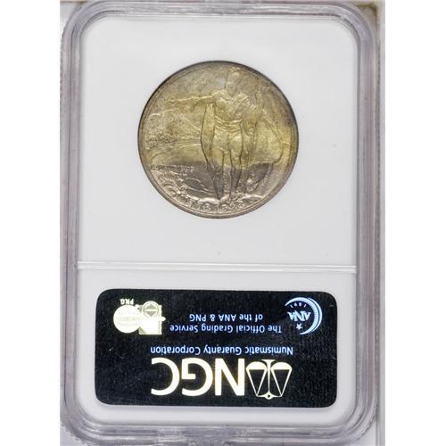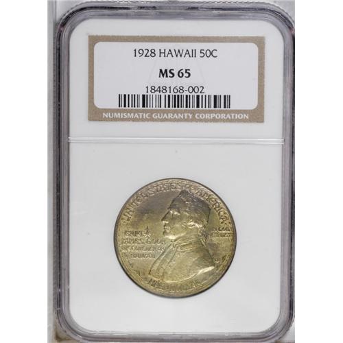 <B>1928<50C> Hawaiian MS65 NGC.</B></I> A magnificent Gem example of this key issue in the commemorative silver series, lightly toned in lush lilac, lemon-yellow, and jade-green. The Hawaiian chieftain is refreshingly free of unsightly abrasions, as are other areas of the coin. Only a couple of minute reeding marks in the left obverse field are noted, consistent with the grade. Color aficionados as well as series specialists would do well to give this lot serious attention, as the hunt for a nicer-looking example would be hard ... and perhaps fruitless.