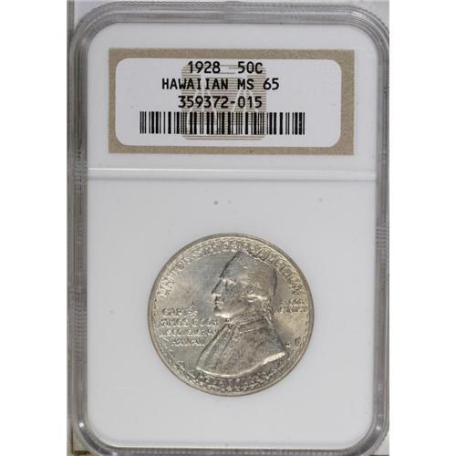 <B>1928 50C Hawaiian MS65 NGC.</B></I> A near-brilliant Gem with blazing luster and a seemingly unimprovable strike. The surfaces, which have a touch of tan in the fields, exhibit pleasing eye appeal and only trivial marks overall. It is often noted that while the design proclaims Captain James Cook the "discoverer of Hawaii," the island chain was already inhabited prior to his arrival and had seen its share of chieftains, including the unifying King Kamehameha.<BR><BR><b>Shipping:</b> Coin/Currency (<a target="_blank" href="http://www.heritageauctions.com/common/shipping.php">view shipping information</a>)