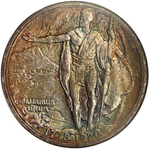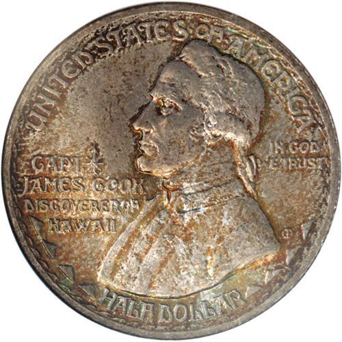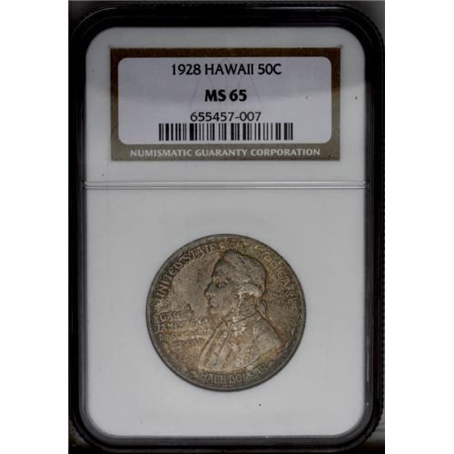 <B>1928<50C> Hawaiian MS65 NGC.</B></I> Outstanding definition adorns the intricately-designed motifs, including the features along the beach. A mix of reddish-gold, mauve, gray, lavender, and green patination blankets both sides, overlying pleasing luster. Refreshingly preserved surfaces reveal just a few light marks on the reverse. NGC has certified 51 pieces finer (3/06). <BR><BR><B>Important notice:</B> Heritage usually auctions material at the rate of 200-250 lots per hour. On some occasions eBay Live bid software or the Internet may not be able to keep up with the pace of the auction. We recommend placing a realistic absentee bid now as insurance to avoid disappointment. Occasionally the auctioneer may eliminate or reject an eBay Live bid, and the auctioneer may also reopen a lot after the close of the eBay live bidding (usually because we missed an audience bid), and may reject your bid even if it shows you as the winning bidder. By bidding via eBay Live, you agree that Heritage may award the lot to another bidder at its sole discretion under the circumstances described above or any other reasonable circumstances. Since eBay bids are not shown to us until we open the lot on the floor, we treat those bids just like floor bids. In most cases the floor responds before the eBay bid is presented to us, due to Internet lag time, so for consistency we have made it a policy that floor bids are always considered first over tie eBay live bids. Also please note that all Heritage lots purchased through eBay Live carry a 20% Buyer's Premium. Please make sure you read the Terms and Conditions before you bid. This lot is being auctioned in conjunction with a live floor auction by Heritage Galleries & Auctioneers. All final auction and invoice information will be supplied by Heritage Galleries & Auctioneers, and all other information should be considered preliminary. Lot:4954 <BR><BR><B>Winning Notification and Billing:</B> After the FINAL session in this auction is complete, Heritage will send e-mail and snail mail invoices. This process normally takes several days. All final auction and invoice information will be supplied by Heritage Galleries & Auctioneers, and all other information should be considered preliminary. <BR><BR>This auction will be conducted on a live auction floor and over the Internet through eBay Live. If you choose to place an absentee bid, please take a moment to <font color='#0000ff'><u><a href='http://pages.ebay.com/liveauctions/help/before/laabsentee.html'>learn how eBay Live absentee bidding works</a></u></font><font color='#000000'>