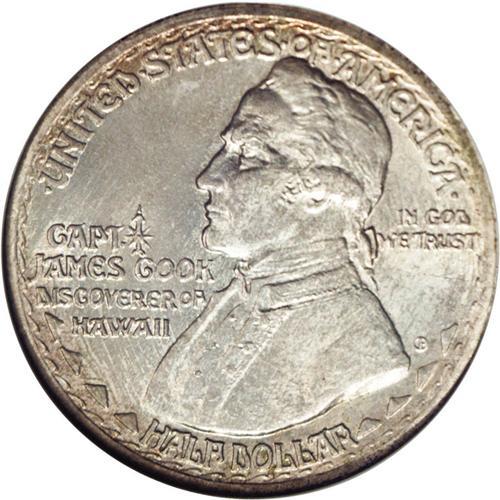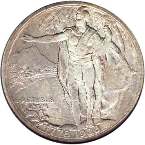 <B>1928<50C> Hawaiian MS65 NGC.</B></I> The Hawaiian is the most coveted type in the silver commemorative series. The mintage of 9,958 pieces (not including the fifty sandblast proofs) is the lowest for any silver type, although the Hudson and Spanish Trail are close behind. The different between the three types is in their distribution: the Hudson and Spanish Trail issues were sold to collectors, while a large portion of the Hawaiian production was reserved for residents of the island territory, many of whom were non-numismatists. The present sharply struck and satiny Gem exhibits pearl-gray, sky-blue, and pink-gold toning. The smooth surfaces lack mentionable marks.