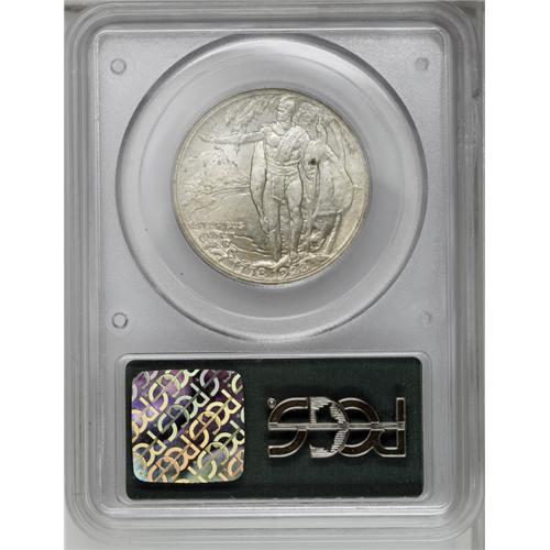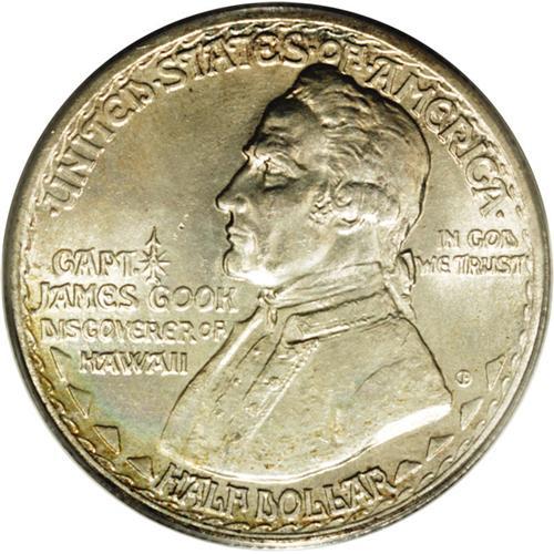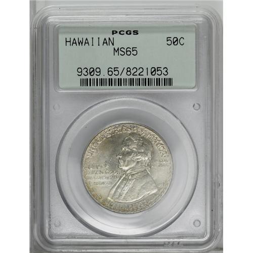 <B>1928<50C> Hawaiian MS65 PCGS.</B></I> A solid Gem representative of this scarce and sought-after issue that celebrates the 150th anniversary of Captain James Cook's landing in the Sandwich Islands. Frosty luster is accented by a crescent of multicolored across the lower portion of the obverse. Only a few inconsequential surface marks are detected here and there. <BR><BR><B>Important notice:</B> Heritage usually auctions material at the rate of 200-250 lots per hour. On some occasions eBay Live bid software or the Internet may not be able to keep up with the pace of the auction. We recommend placing a realistic absentee bid now as insurance to avoid disappointment. Occasionally the auctioneer may eliminate or reject an eBay Live bid, and the auctioneer may also reopen a lot after the close of the eBay live bidding (usually because we missed an audience bid), and may reject your bid even if it shows you as the winning bidder. By bidding via eBay Live, you agree that Heritage may award the lot to another bidder at its sole discretion under the circumstances described above or any other reasonable circumstances. Since eBay bids are not shown to us until we open the lot on the floor, we treat those bids just like floor bids. In most cases the floor responds before the eBay bid is presented to us, due to Internet lag time, so for consistency we have made it a policy that floor bids are always considered first over tie eBay live bids. Also please note that all Heritage lots purchased through eBay Live carry a 20% Buyer's Premium. Please make sure you read the Terms and Conditions before you bid. This lot is being auctioned in conjunction with a live floor auction by Heritage Galleries & Auctioneers. All final auction and invoice information will be supplied by Heritage Galleries & Auctioneers, and all other information should be considered preliminary. Lot:4953 <BR><BR><B>Winning Notification and Billing:</B> After the FINAL session in this auction is complete, Heritage will send e-mail and snail mail invoices. This process normally takes several days. All final auction and invoice information will be supplied by Heritage Galleries & Auctioneers, and all other information should be considered preliminary. <BR><BR>This auction will be conducted on a live auction floor and over the Internet through eBay Live. If you choose to place an absentee bid, please take a moment to <font color='#0000ff'><u><a href='http://pages.ebay.com/liveauctions/help/before/laabsentee.html'>learn how eBay Live absentee bidding works</a></u></font><font color='#000000'>