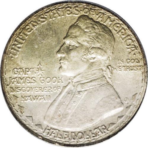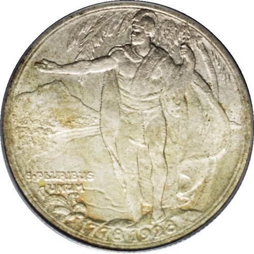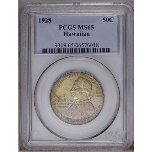 <B>1928<50C> Hawaiian MS65 PCGS.</B></I> Olive-gold and lilac patina graces both sides of this lovely Gem in a somewhat variegated fashion. Sharply struck and with good underlying luster. The surfaces are well preserved, with the obverse nearly pristine. The most coveted of all commemorative types in Gem condition.