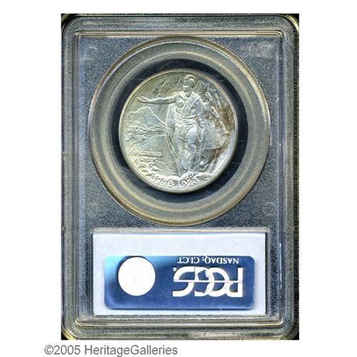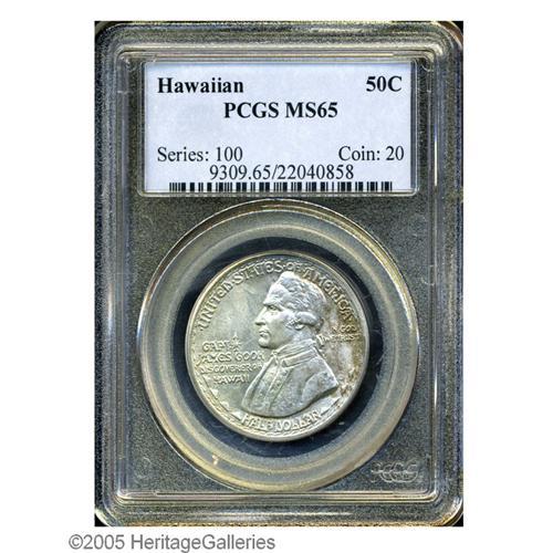 <B>1928<50C> Hawaiian MS65 PCGS.</B></I> The surfaces display a hard, metallic sheen and are generally untoned except for areas of russet patina that is seen at the right side of the obverse and reverse. A problem-free Gem.