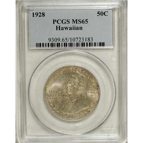 <B>1928 50C Hawaiian MS65 PCGS.</B></I> This solidly struck Gem possesses pleasing luster. Each side displays elegant emerald and gold patina with occasional splashes of russet near the periphery. Though the tiny regular-strike mintage consists of only 9,958 non-proofs, the Hawaiian issue is notable for its comparative lack of misbehavior on the part of the distributors.<BR><BR><b>Shipping:</b> Coins & Currency (<a target="_blank" href="http://www.heritageauctions.com/common/shipping.php">view shipping information</a>)