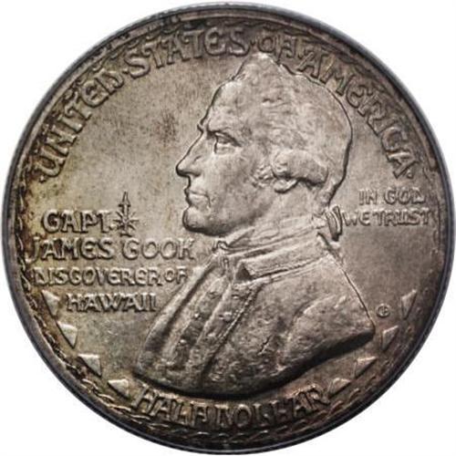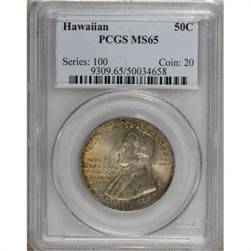 <B>1928 50C Hawaiian MS65 PCGS.</B></I> This is a pleasingly original Gem example of the Hawaiian half dollar, struck to commemorate the 150th anniversary of Captain James Cook's arrival on the Hawaiian islands. Well struck with shimmering, satiny luster, both sides display a light, relatively even coating of tan and gray coloration. Two or three small marks are noted on the obverse that seem entirely consistent with the Gem grade assessment. <BR><BR><b>Shipping:</b> Coins & Currency (<a target="_blank" href="http://www.heritageauctions.com/common/shipping.php">view shipping information</a>\)