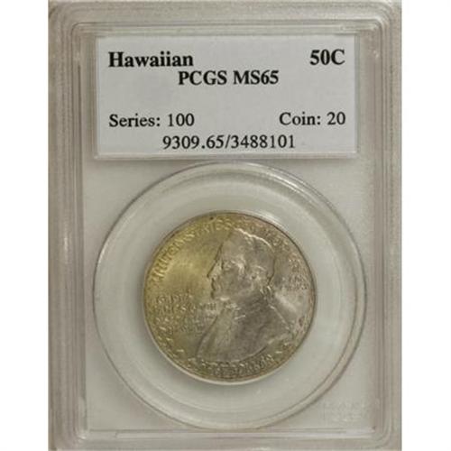 <B>1928 50C Hawaiian MS65 PCGS.</B></I> Like many Hawaiian half dollars in numismatic circulation today, this piece has a distinctive combination of subtle gray and lime toning, each color covering part of the obverse and reverse surface. It seems that these pieces are from the 1986 auction sale of pieces from the Bank of Hawaii holdings. This example has excellent surfaces with strong design details.<BR><BR><b>Shipping:</b> Coins & Currency (<a target="_blank" href="http://www.heritageauctions.com/common/shipping.php">view shipping information</a>\)