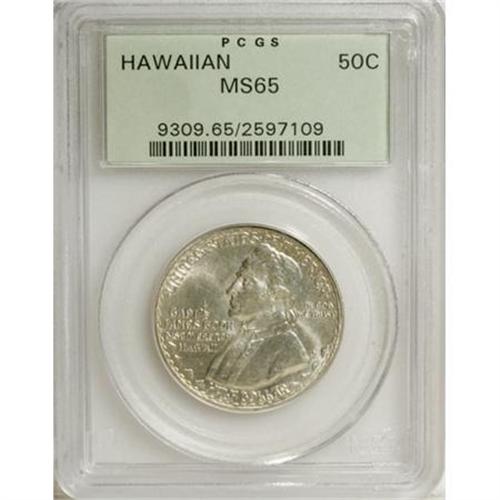 <B>1928 50C Hawaiian MS65 PCGS.</B></I> Potent luster and light yellow-gold toning testify to the originality of this precisely struck Gem. Undisturbed save for a hair-thin mark near the N in UNITED. The Hawaiian is well known as the key to a silver commemorative type set, and Gems are especially coveted. Encased in a green label holder.<BR><I>From The Sterling Collection.</B></I><BR><BR><b>Shipping:</b> Coins & Currency (<a target="_blank" href="http://www.heritageauctions.com/common/shipping.php">view shipping information</a>)