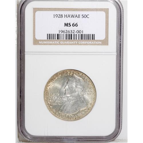 <B>1928<50C> Hawaiian MS66 PCGS.</B></I> Both sides of this lovely Premium Gem have frosty silver luster framed by peripheral gold toning with similarly colored freckles in the fields. Only the most trivial blemishes appear on the surfaces. This example is among the best specimens reasonably obtainable today, with only three finer pieces certified by NGC. Census: 56 in 66, 3 finer (9/06).