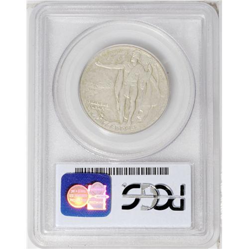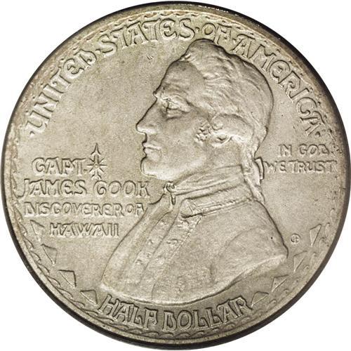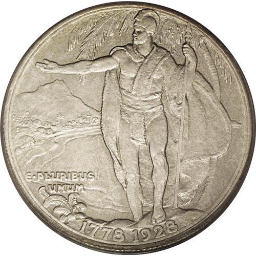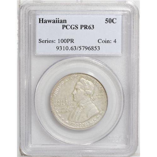 <B>1928<50C> Hawaiian PR63 PCGS.</B></I> The Hawaiian Sesquicentennial half dollar was designed by Juliette May Fraser, a native of Honolulu and apparently unrelated to the husband and wife coin designing team of James Earle Fraser and Laura Gardin Fraser. Total mintage for this issue in all versions was 10,008 coins, and all were distributed, an unusual situation in the field of commemorative coins. This distribution took nearly 60 years to accomplish, as the last of these pieces were not sold until 1986.<BR> Just 50 proofs were produced using a special sandblast process that produced a matte-like dull gray finish to the coins. This example is one of those with hints of pale yellow toning on each side. Both surfaces have a few scattered marks that prevent a higher grade, but the overall appearance and quality is impressive.