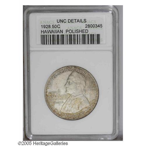 <B>1928<50C> Hawaiian--Polished--ANACS. Unc. Details.</B></I> A glossy and faintly hairlined representative, since toned in orange and steel-blue colors. A key commemorative type.<BR><I>From The Henry R. Luhrs Collection.</B></I>