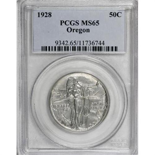 <B>1928 50C Oregon MS65 PCGS.</B></I> PCGS Population (569/408). NGC Census: (402/471). Mintage: 6,028. Numismedia Wsl. Price for NGC/PCGS coin in MS65: $296. (#9342)<BR><BR><b>Shipping:</b> Coins & Currency (<a target="_blank" href="http://www.heritageauctions.com/common/shipping.php">view shipping information</a>)