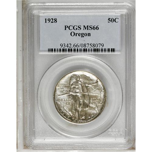 <B>1928<50C> Oregon MS66 PCGS.</B></I> Iridescent pewter-gray color and frosty luster provide exceptional eye appeal. This is a fully struck example with hints of champagne toning.