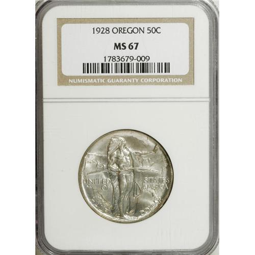 <B>1928 50C Oregon MS67 NGC.</B></I> Well struck with satin luster and pleasing hints of steel-blue and antique-gold toning. Carefully preserved and minimally marked. Census: 74 in 67, 3 finer (3/07).<BR><BR><b>Shipping:</b> Coins & Currency (<a target="_blank" href="http://www.heritageauctions.com/common/shipping.php">view shipping information</a>)