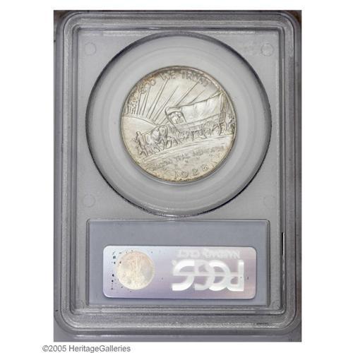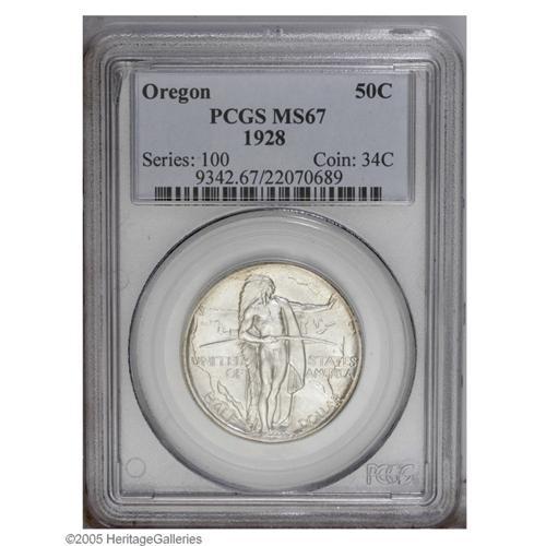 <B>1928<50C> Oregon MS67 PCGS.</B></I> Blast white obverse with creamy satin fields give the Indian a "chiseled in stone" look. The reverse has a halo of russet golden toning further complimenting the mark free fields on both sides. Only three pieces have been certified finer by NGC and PCGS combined (10/5).
