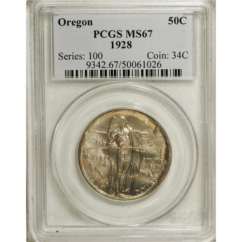 <B>1928 50C Oregon MS67 PCGS.</B></I> Though Oregon Trail halves were coined at Philadelphia in 1928, the pieces went unreleased until 1933, when the distributors created an artificial "sellout" of the 1926-S issue by having the unsold remainder melted. Soft sky-blue, pink, and peach patina graces the surfaces of this shining Superb Gem, which is tied for the finest graded by PCGS (4/07).<BR><I>From The Cary & Cheryl Porter Collection.</B></I><BR><BR><b>Shipping:</b> Coins & Currency (<a target="_blank" href="http://www.heritageauctions.com/common/shipping.php">view shipping information</a>)