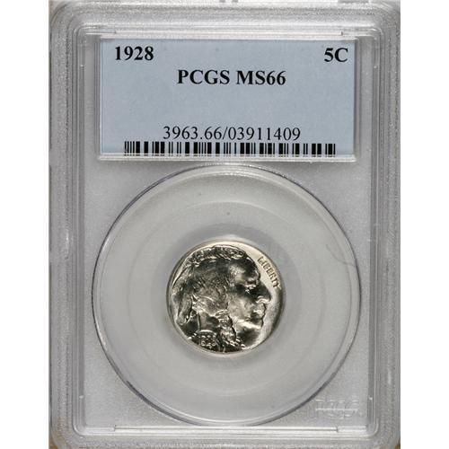 <B>1928 5C MS66 PCGS.</B></I> A striking Premium Gem, untoned with frosty surfaces and a small patch of mirror brilliance below the chin. Carefully preserved with needle-sharp detail on the head, unusual for this issue. PCGS has graded only 12 coins finer (4/07).<BR><BR><b>Shipping:</b> Coins & Currency (<a target="_blank" href="http://www.heritageauctions.com/common/shipping.php">view shipping information</a>)