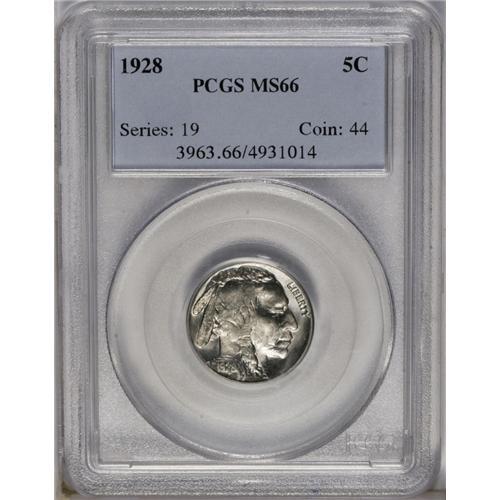 <B>1928<5C> MS66 PCGS.</B></I> Frosty luster covers the largely untoned surfaces, which are accented by light blue toning. The strike is above average, especially on the reverse, with nearly full detail on the bison's head.<BR><I>From The Chicago-Ark Collection.</B></I>