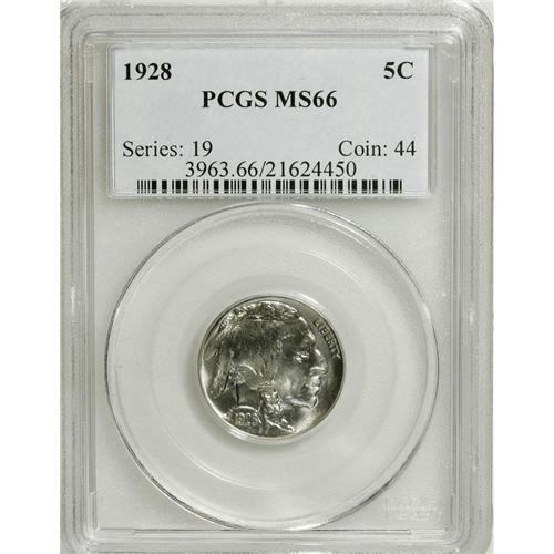 <B>1928 5C MS66 PCGS.</B></I> Powder-blue dominates the obverse. The reverse has apricot and green-gold shadings. Booming luster sweeps the unperturbed fields and devices. As a Philadelphia issue, the 1928 receives less attention, but Premium Gems are nonetheless scarce.<BR><BR><b>Shipping:</b> Coins & Currency (<a target="_blank" href="http://www.heritageauctions.com/common/shipping.php">view shipping information</a>)