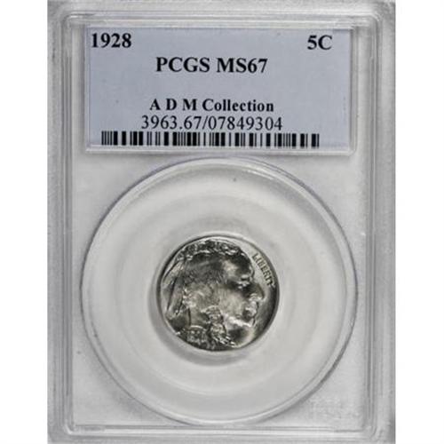 <B>1928 5C MS67 PCGS.</B></I> While generally considered a common date, the 1928 is conditionally rare in MS67 grade (the highest grade obtainable). Only 12 pieces have been so graded by PCGS, and another five coins have been certified in this grade by NGC (8/07). The surfaces are extraordinarily lustrous. Just the slightest hint of toning is present, the coin generally presents as brilliant. Sharply defined throughout.<BR><BR><B>Coin Engraver:</B> James E. Fraser<BR><BR><b>Shipping:</b> Coins & Currency (<a target="_blank" href="http://www.heritageauctions.com/common/shipping.php">view shipping information</a>)