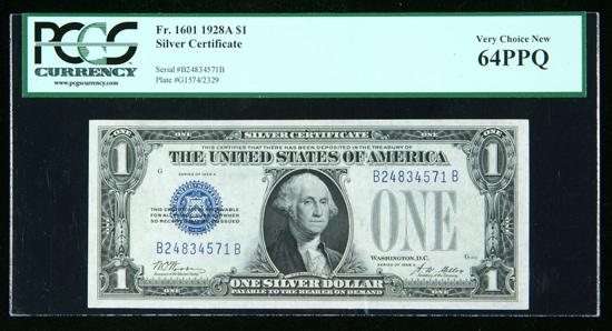 1928-A, $1 Silver Certificate. PCGS Currency Very Choice New 64PPQ. . Fr-1601. A beautiful near-Gem "Funnyback."