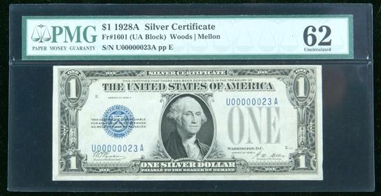 1928-A, $1 Silver Certificate. PMG Uncirculated 62. . Fr-1601. Low serial number U00000023A.