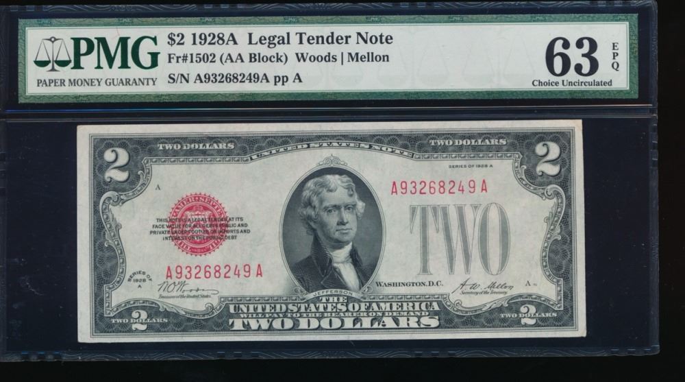 One 1928-A $2 Legal Tender Note PMG 63EPQ.