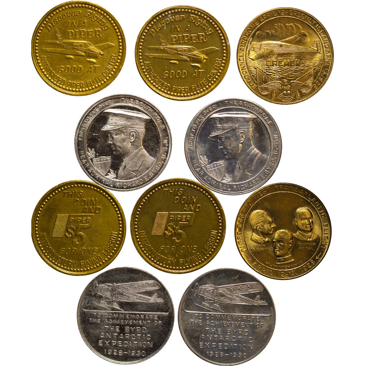 Lot of 5. Piper Flying Promotion $5 Coins, Adm. Byrd 1928-1930 Antarctic Expedition Commemorative Tokens, "FIRST EAST TO WEST TRANSATLANTIC FLIGHT APRIL 12-13, 1928" Commemorative Token - Weber Collection