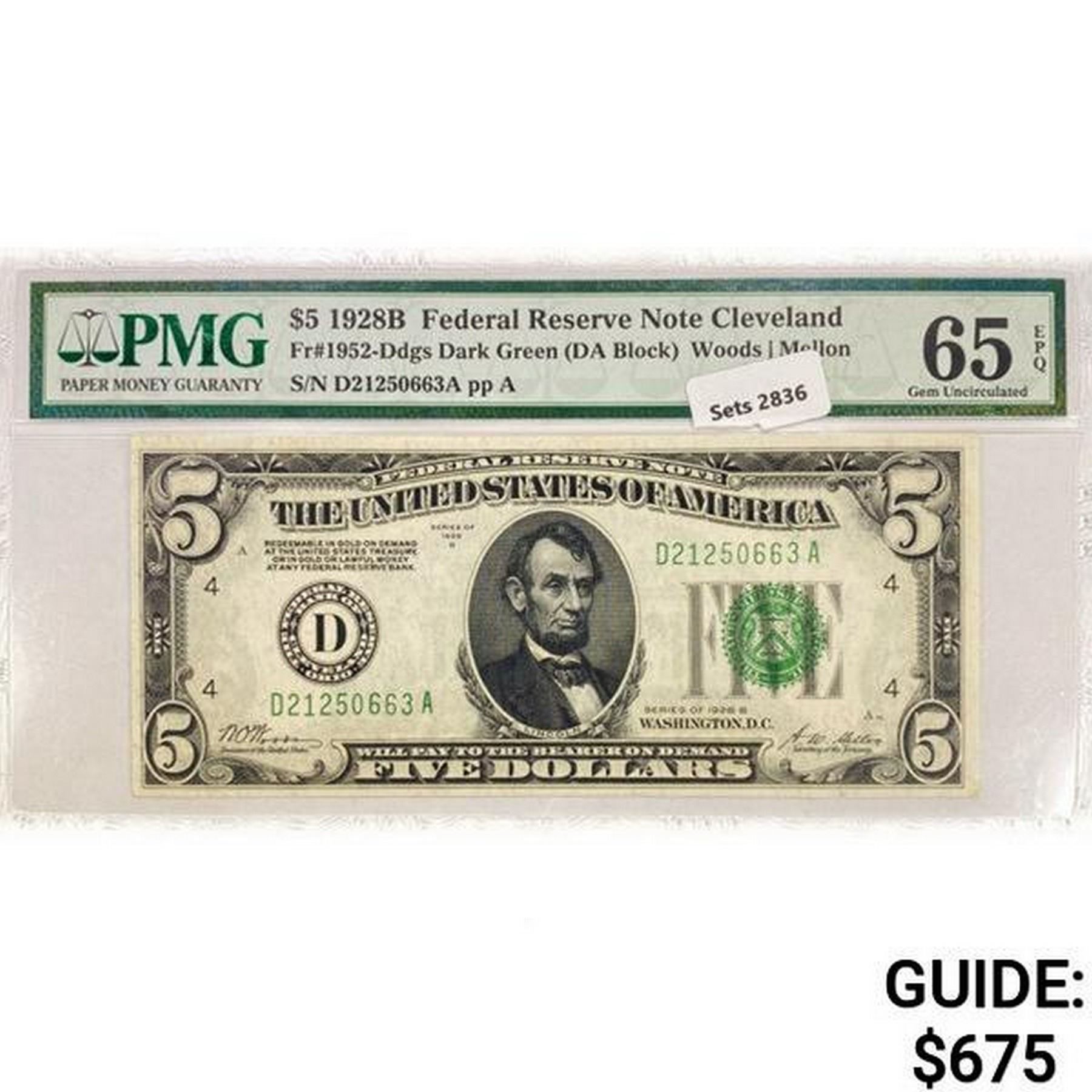 1928 B $5 Fed Reserve Note PMG GEM UNC 65
