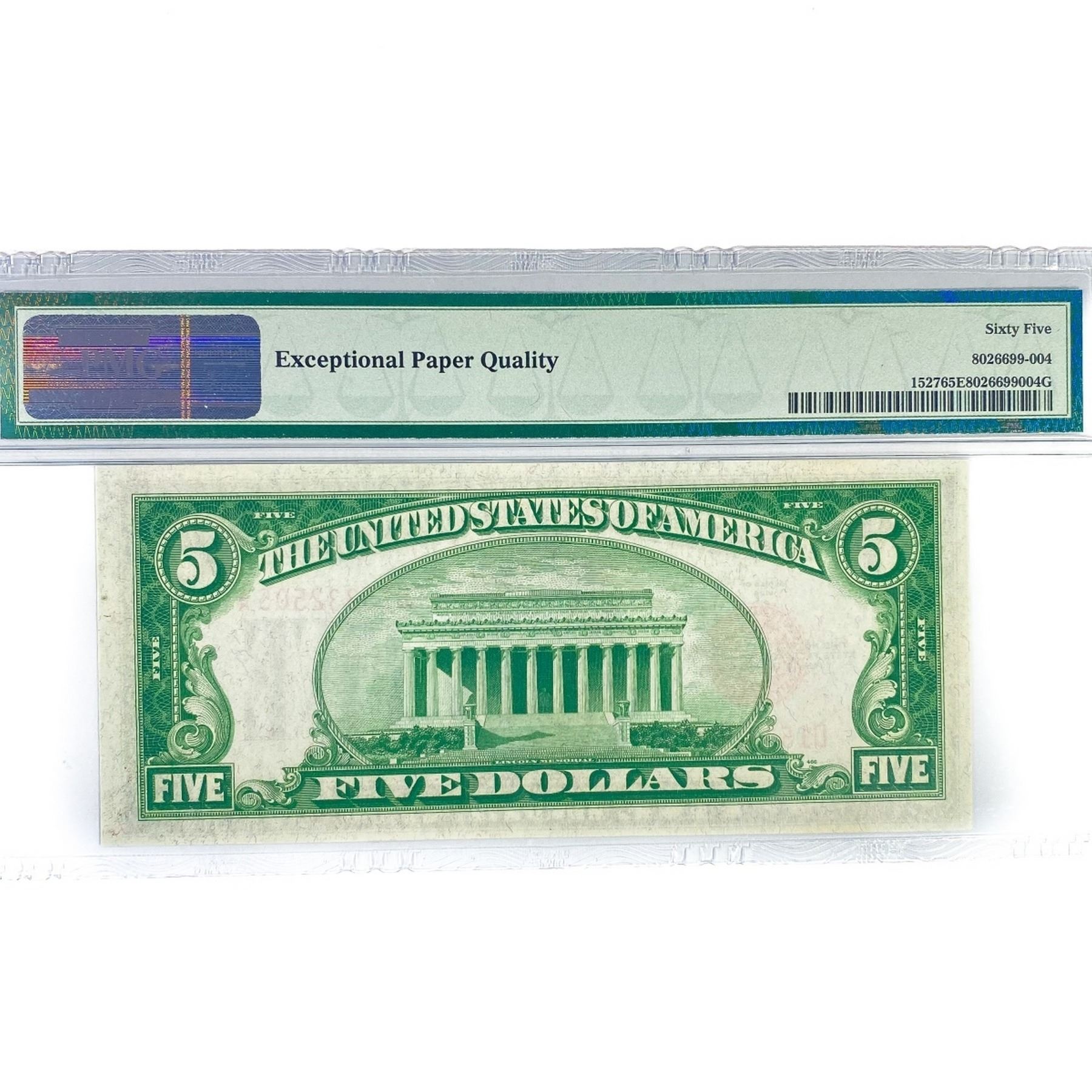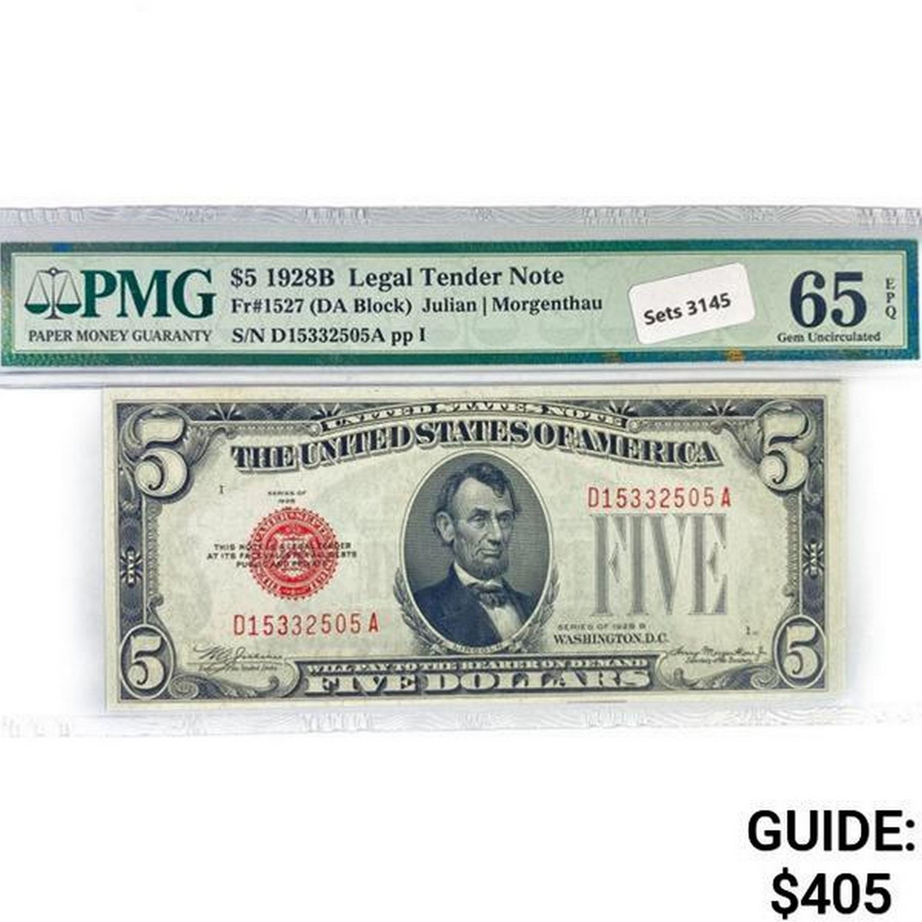 1928 B $5 Legal Tender Note PMG GEM UNC 65