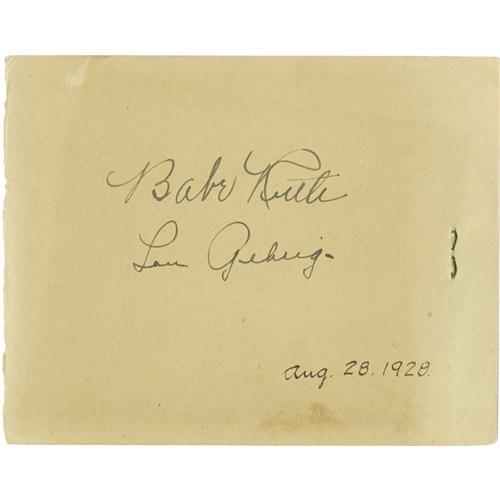 <B>1928 Babe Ruth & Lou Gehrig Signed Album Page.</B></I> If you're searching for the perfect pairing of these iconic Golden Age Yankees, look no further. Here we provide the discerning collector with a pair of 10/10 black fountain pen autographs from Number Three and Number Four, placed together so perfectly at the center of a 4x5" album page that it's almost as Lou and the Babe could foresee a future collector matting and framing the page together with their favorite photo of the Yankee duo. An unknown hand dates the page to the World Championship season of 1928. A staple appears well clear of the autographs at right, and a bit of rough edges at left likewise has zero effect on visual display. In a word, unimprovable. <I>LOA from PSA/DNA. LOA from James Spence Authentication.</B></I><BR><BR><b>Shipping:</b> Flat Material, Small (<a target="_blank" href="http://www.heritageauctions.com/common/shipping.php">view shipping information</a>)