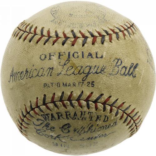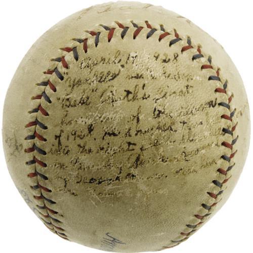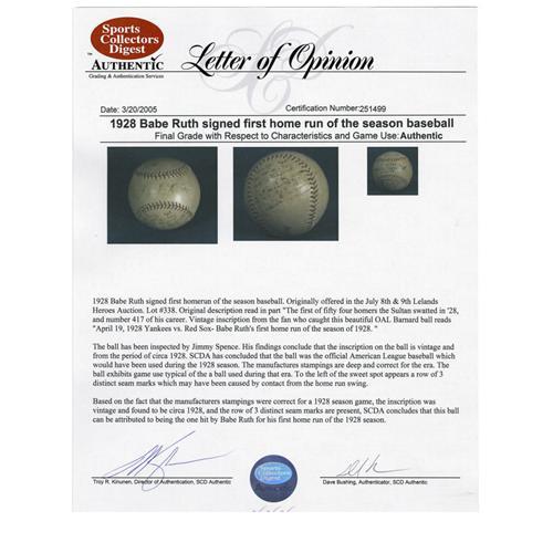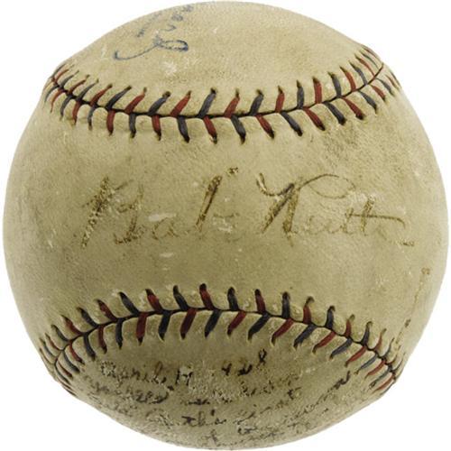 <B>1928 Babe Ruth Signed First Home Run Baseball of the Season.</B></I> When Babe Ruth stepped to the plate at Fenway Park on April 19, 1928, he was quite literally at the summit of his enormous fame. The season of 1928 had begun only days earlier, and the baseball world was emerging from a long, cold winter with a single name on its lips. Ruth. The New York Yankees slugger's 1927 season was something bordering upon the supernatural, and there was not a baseball fan alive who didn't ache to witness his magical ways in person. Consider this--the top three home run sluggers of the '27 season wore Yankee pinstripes. Lou Gehrig was runner-up with an amazing forty-seven. Tony Lazzeri took the bronze with just eighteen. The Ringling Brothers circus wasn't the greatest show on earth, Murderer's Row was. And there was no question as to which man was the ringleader.<BR><BR> How conflicted those fans turning out to see their Red Sox meet the Yankees that sunny spring day in 1928 must have felt, remembering that the Babe had once resided in their own dugout in Boston, and wishing almost simultaneously that he would strike out and that they could see that fabled home run power for themselves. Those traitorous desires were quickly satisfied when the Bambino applied a tremendous swat to this OAL (Barnard) baseball and sent it sailing through the cool New England air and into the right field bleachers of Fenway Park. It was the first of what would total a League-topping fifty-four home runs in the 1928 season, and the 417th of the Babe's career. As Ruth scampered around the bases in his quirky short-strided gait, a fan in the cheap seats gripped this baseball tightly, understanding even then that he held a piece of great value in his hands. Wisely, he sought out the Babe after the game and presented this ball to him, which Ruth graciously blessed with his classic sweet spot signature, today rating a solid 6/10 to 7/10 in quality. A side panel inscription in the same ancient ink as Ruth is in the lucky fan's hand. It reads, "April 19, 1928, Yankees vs. Red Sox - Babe Ruth's first home run of the season of 1928. He launched this ball into the right field bleachers in Fenway Park. Recovered by George..." Here it fades into illegibility, but the story is satisfyingly clear. Leo Durocher, appearing in one of the first ten games of his professional career, appears on a side panel with a boldness comparable in quality to that of his future Cooperstown roommate.<BR><BR> Only a small handful of verified Babe Ruth home run balls have ever surfaced in the collecting hobby, and the status of this specimen as the first of the 1928 World Championship season sets it high in the rankings of that microscopic supply. It's an exceptionally relevant piece, moreso than even the vast majority of artifacts on display at Cooperstown today. <BR><BR><B>Important notice:</B> Heritage usually auctions material at the rate of 200-250 lots per hour. On some occasions eBay Live bid software or the Internet may not be able to keep up with the pace of the auction. We recommend placing a realistic absentee bid now as insurance to avoid disappointment. Occasionally the auctioneer may eliminate or reject an eBay Live bid, and the auctioneer may also reopen a lot after the close of the eBay live bidding (usually because we missed an audience bid), and may reject your bid even if it shows you as the winning bidder. By bidding via eBay Live, you agree that Heritage may award the lot to another bidder at its sole discretion under the circumstances described above or any other reasonable circumstances. Since eBay bids are not shown to us until we open the lot on the floor, we treat those bids just like floor bids. In most cases the floor responds before the eBay bid is presented to us, due to Internet lag time, so for consistency we have made it a policy that floor bids are always considered first over tie eBay live bids. Also please note that all Heritage lots purchased through eBay Live carry a 22.5% Buyer's Premium. Please make sure you read the Terms and Conditions before you bid. This lot is being auctioned in conjunction with a live floor auction by Heritage Galleries & Auctioneers. All final auction and invoice information will be supplied by Heritage Galleries & Auctioneers, and all other information should be considered preliminary. Lot:19653 <BR><BR><B>Winning Notification and Billing:</B> After the FINAL session in this auction is complete, Heritage will send e-mail and snail mail invoices. This process normally takes several days. All final auction and invoice information will be supplied by Heritage Galleries & Auctioneers, and all other information should be considered preliminary. <BR><BR>This auction will be conducted on a live auction floor and over the Internet through eBay Live. If you choose to place an absentee bid, please take a moment to <font color='#0000ff'><u><a href='http://pages.ebay.com/liveauctions/help/before/laabsentee.html'>learn how eBay Live absentee bidding works</a></u></font><font color='#000000'>