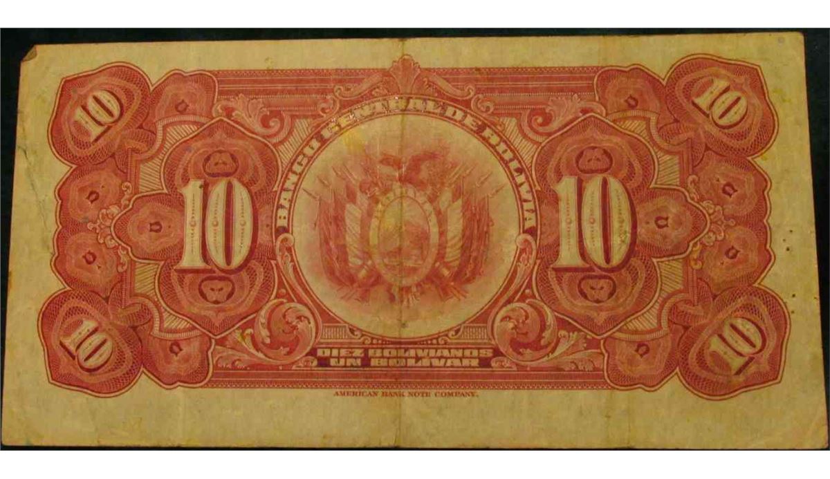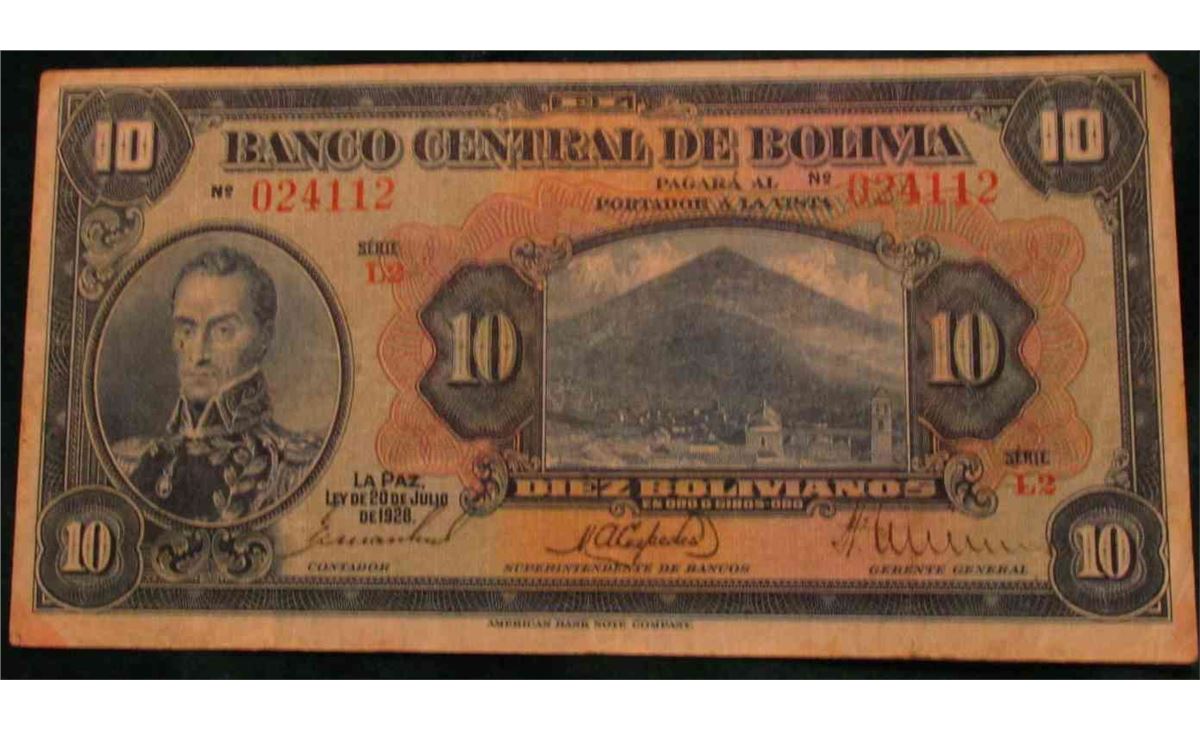 1928 Bolivia 10 Bolivianos Banknote. VF. Scarce.