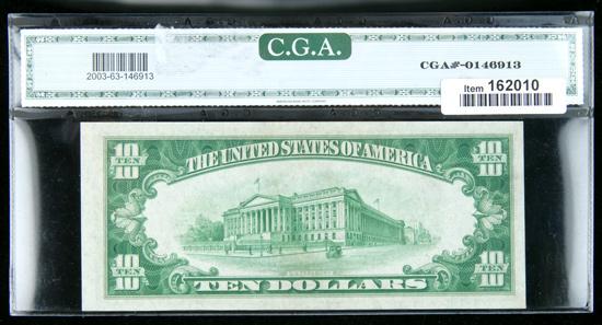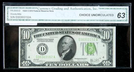 1928-C, $10 Federal Reserve Note. Cleveland. . Fr-2003-D. CGA graded Choice Uncirculated 63. We agree with the grade. A very rare note in this state of preservation.