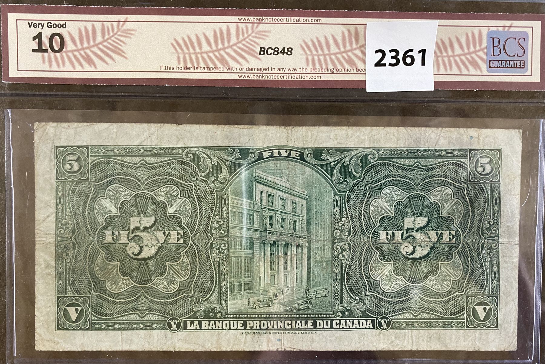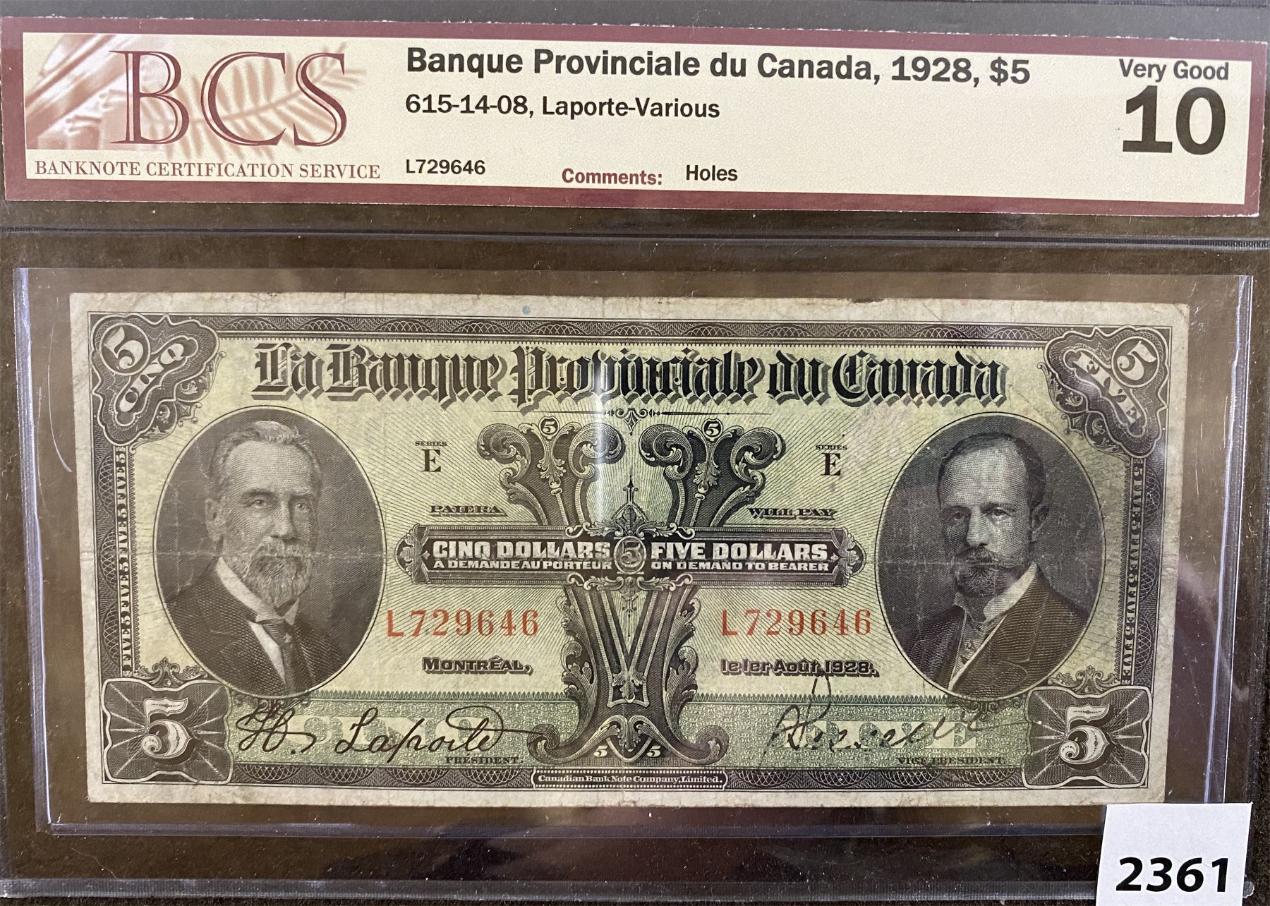 1928 CND FIVE DOLLAR BANQUE PROVINCIALE DU CANADA NOTE - GRADED 10 VERY GOOD