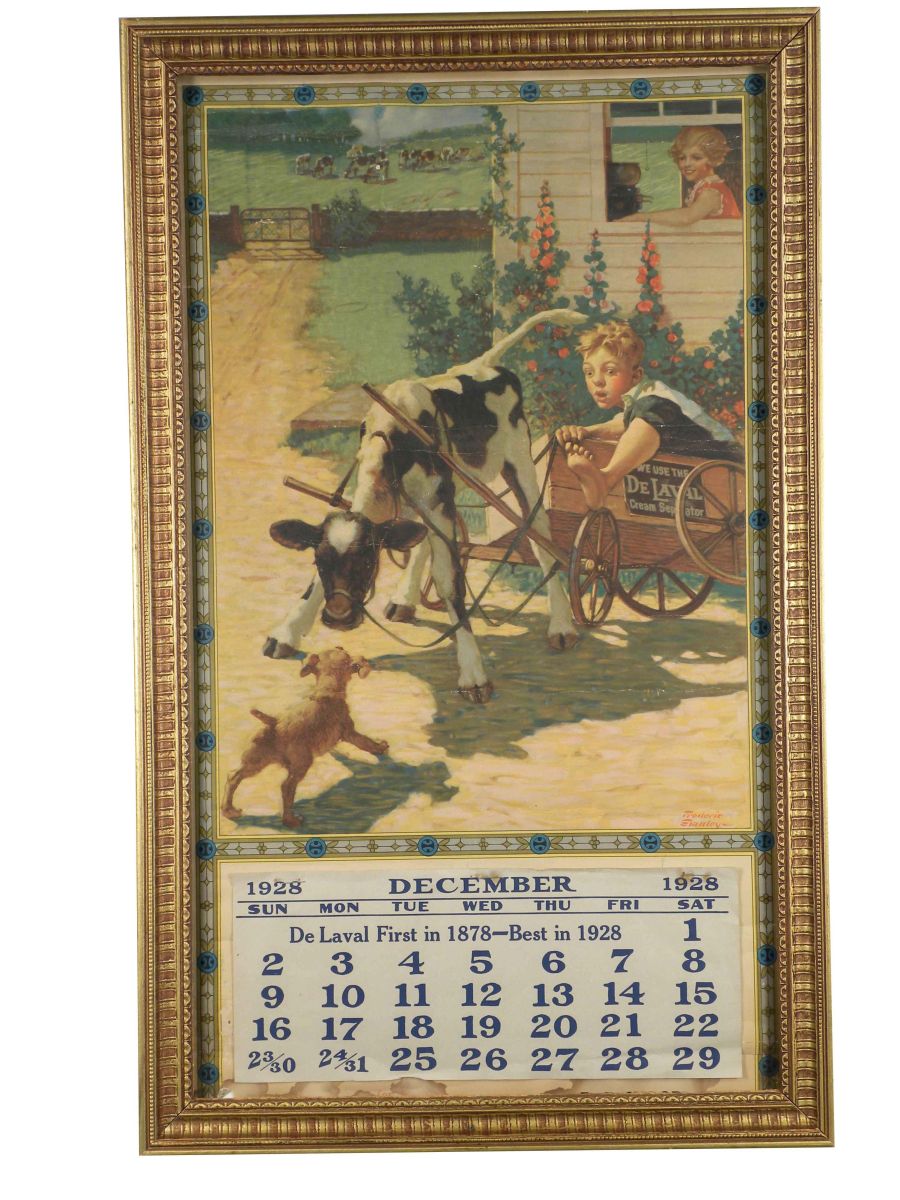 1928 Calendar for DeLaval Cream Separators. Frederic Stanley, artist. Bottom stained and trimmed otherwise good condition, framed under glass. 11 1/2 X 20 inches.