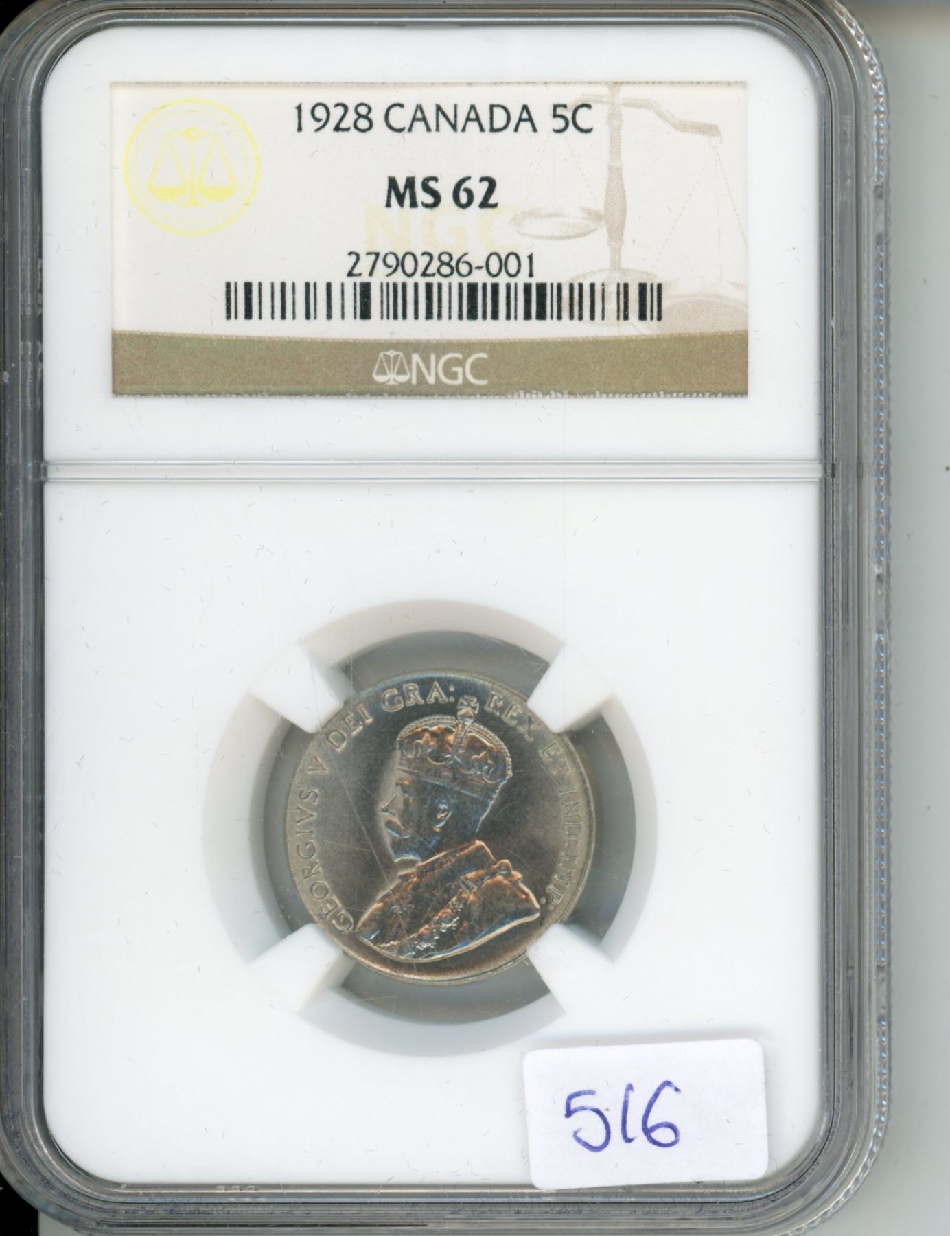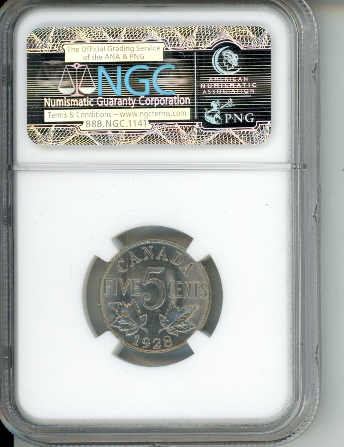1928 Canadian NGC Graded 5 Cent Coin - MS-62