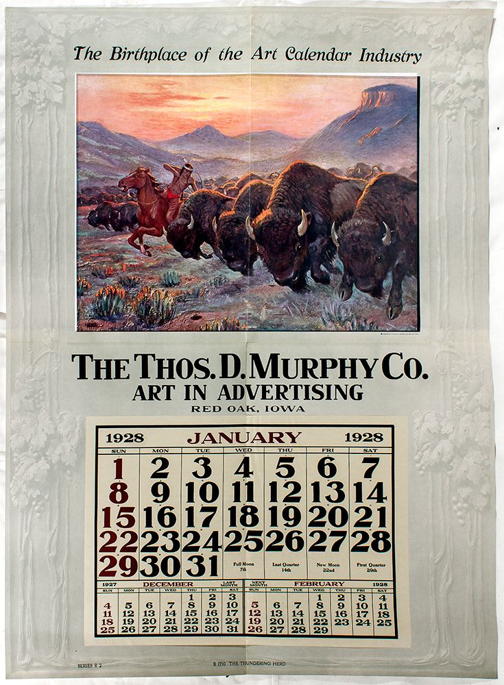 c1928 Titled "The Thundering Herd." this broadside calender from Thomas D. Murphy of Red Oak, IA. measures 32"x 42". It's in very good condition. - HKA#65959