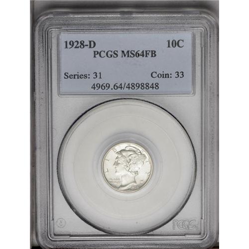 <B>1928-D<10C> MS64 Full Bands PCGS.</B></I> Pinpoint striking definition on each side and brilliant with a hard, satin-like sheen. There are no mentionable marks on either side.