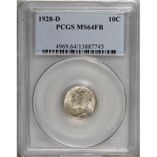 <B>1928-D 10C MS64 Full Bands PCGS.</B></I> Sharply struck and well preserved, this satiny near-Gem is virtually pristine. The nearly untoned light-gray surfaces reveal mere wisps of gold color on each side. If the luster were a bit stronger, this piece might have been graded as a Gem. <BR><BR><B>Coin Engraver:</B> Adolph A. Weinman<BR><BR><b>Shipping:</b> Coins & Currency (<a target="_blank" href="http://www.heritageauctions.com/common/shipping.php">view shipping information</a>)