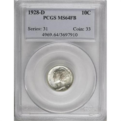 <B>1928-D 10C MS64 Full Bands PCGS.</B></I> The shining silver-white surfaces of this late 1920s mintmarked issue show small sections of reddish-gold patina. Decisively struck with a handful of wispy marks that deny a Gem grade.<BR><BR><B>Coin Engraver:</B> Adolph A. Weinman<BR><BR><b>Shipping:</b> Coins & Currency (<a target="_blank" href="http://www.heritageauctions.com/common/shipping.php">view shipping information</a>)