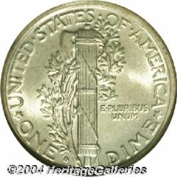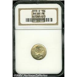 <B>1928-D<10C> MS65 Full Bands NGC.</B></I> There is a thin covering of natural opaque patina on both sides with bare hints of dappled russet shadings around the obverse border. A frosty textured Gem with fully split crossbands. The 1928-D is a difficult issue to locate in MS65, even without Full Bands definition. Needless to say, expertly produced Gems are of the utmost desirability among collectors who specialize in this popular 20th century series. Population: 16 in 65, 10 finer (9/04). <BR><BR><B>Important notice:</B> Heritage usually auctions material at the rate of 200-250 lots per hour. On some occasions eBay Live bid software or the Internet may not be able to keep up with the pace of the auction. We recommend placing a realistic absentee bid now as insurance to avoid disappointment. Occasionally the auctioneer may eliminate or reject an eBay Live bid, and the auctioneer may also reopen a lot after the close of the eBay live bidding (usually because we missed an audience bid), and may reject your bid even if it shows you as the winning bidder. By bidding via eBay Live, you agree that Heritage may award the lot to another bidder at its sole discretion under the circumstances described above or any other reasonable circumstances. Since eBay bids are not shown to us until we open the lot on the floor, we treat those bids just like floor bids. In most cases the floor responds before the eBay bid is presented to us, due to Internet lag time, so for consistency we have made it a policy that floor bids are always considered first over tie eBay live bids. Also please note that all Heritage lots purchased through eBay Live carry a 20% Buyer's Premium. Please make sure you read the Terms and Conditions before you bid.