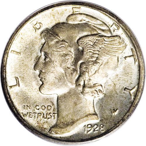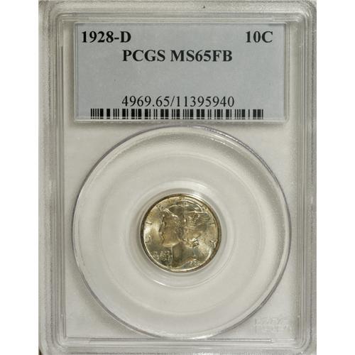 <B>1928-D 10C MS65 Full Bands PCGS.</B></I> The 1928-D dime is common only in lower grades. Very Fine and Extremely Fine specimens are somewhat scarce, and About Uncirculated and lower Mint State coins are seldom encountered. Near-Gem and finer pieces are elusive, with or without Full Bands. Additionally, David Lange (2005) writes: "More of a problem than incomplete bands ... is a particular susceptibility to flatness in the legends. This phenomenon appears with nearly all dates in this series, but 1928-D rarely appears without it." The boldness of strike on the Gem in this lot transcends the middle bands to encompass nearly all of the design elements. The diagonal bands are sharp, as are the date digits and mintmark, and nearly all of the lettering. To be completely accurate, we mention that just a couple of peripheral letters on each side reveal a touch of softness in their outward portions. Whispers of golden-tan rest upon radiantly lustrous surfaces that exhibit a few inoffensive ticks that prevent this gorgeous specimen from attaining a higher grade. Population: 56 in 65 Full Bands, 17 finer (2/07).<BR><BR><b>Shipping:</b> Coins & Currency (<a target="_blank" href="http://www.heritageauctions.com/common/shipping.php">view shipping information</a>)