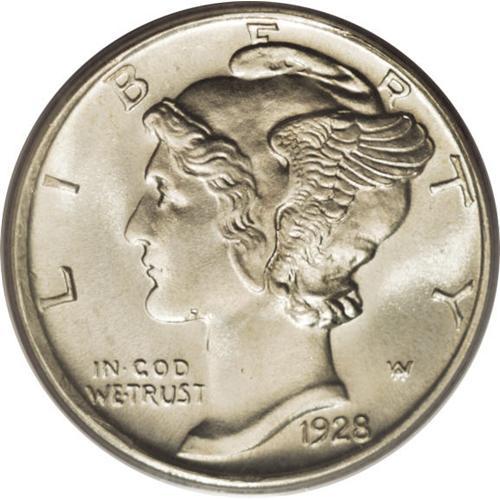 <B>1928-D 10C MS65 Full Bands PCGS.</B></I> The lustrous surfaces are mostly brilliant on each side. The strike is a bit weak at the peripheries, as typically seen, but bold in the center (where commercially, the quality of the strike is most important). A shallow nick on the fully split bands on the reverse is noted, as is a minor, most likely mint-made curved imperfection on Liberty's jaw. Impressive quality.<BR><BR><b>Shipping:</b> Coins & Currency (<a target="_blank" href="http://www.heritageauctions.com/common/shipping.php">view shipping information</a>)