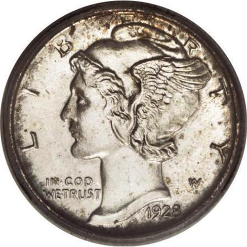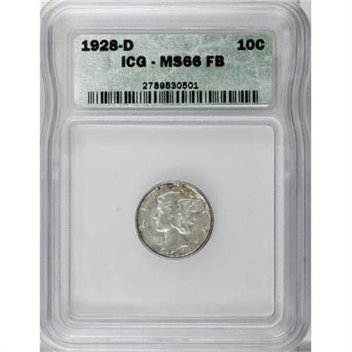 <B>1928-D 10C MS66 Full Bands ICG.</B></I> A scarce issue in Mint State, even before the Full Bands qualifier. This piece displays considerable luster over mostly silver-gold surfaces, tinged with darker amber-gold near the obverse rims. The surfaces are frosty, and all of the fasces bands are well detailed. <BR><BR><B>Coin Engraver:</B> Adolph A. Weinman<BR><BR><b>Shipping:</b> Coins & Currency (<a target="_blank" href="http://www.heritageauctions.com/common/shipping.php">view shipping information</a>)