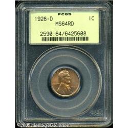 <B>1928-D 1C MS64 Red PCGS.</B></I> The 1928-D is scarce with full color and in high grade. This piece just misses full Gem status by the presence of several abrasions on the reverse. Exceptional, even color and sharply defined as well. Lot:5506