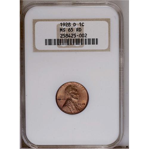 <B>1928-D<1C> MS65 Red NGC.</B></I> Atypically bold with radiant golden-orange surfaces. While not among the most challenging branch mint Lincoln issues from this decade in Uncirculated grades, the 1928-D is decidedly scarce once the Gem/Red level is reached. Census: 31 in 65, 3 finer (3/06). <BR><BR><B>Important notice:</B> Heritage usually auctions material at the rate of 200-250 lots per hour. On some occasions eBay Live bid software or the Internet may not be able to keep up with the pace of the auction. We recommend placing a realistic absentee bid now as insurance to avoid disappointment. Occasionally the auctioneer may eliminate or reject an eBay Live bid, and the auctioneer may also reopen a lot after the close of the eBay live bidding (usually because we missed an audience bid), and may reject your bid even if it shows you as the winning bidder. By bidding via eBay Live, you agree that Heritage may award the lot to another bidder at its sole discretion under the circumstances described above or any other reasonable circumstances. Since eBay bids are not shown to us until we open the lot on the floor, we treat those bids just like floor bids. In most cases the floor responds before the eBay bid is presented to us, due to Internet lag time, so for consistency we have made it a policy that floor bids are always considered first over tie eBay live bids. Also please note that all Heritage lots purchased through eBay Live carry a 20% Buyer's Premium. Please make sure you read the Terms and Conditions before you bid. This lot is being auctioned in conjunction with a live floor auction by Heritage Galleries & Auctioneers. All final auction and invoice information will be supplied by Heritage Galleries & Auctioneers, and all other information should be considered preliminary. Lot:651 <BR><BR><B>Winning Notification and Billing:</B> After the FINAL session in this auction is complete, Heritage will send e-mail and snail mail invoices. This process normally takes several days. All final auction and invoice information will be supplied by Heritage Galleries & Auctioneers, and all other information should be considered preliminary. <BR><BR>This auction will be conducted on a live auction floor and over the Internet through eBay Live. If you choose to place an absentee bid, please take a moment to <font color='#0000ff'><u><a href='http://pages.ebay.com/liveauctions/help/before/laabsentee.html'>learn how eBay Live absentee bidding works</a></u></font><font color='#000000'>