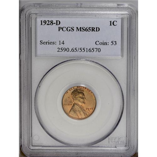 <B>1928-D<1C> MS65 Red PCGS.</B></I> The design elements are boldly impressed, and the lustrous coppery-gold surfaces appear to be free of significant abrasions. The remnants of a partial, hardly noticeable fingerprint can be seen in the upper left obverse field. Population: 67 in 65, 10 finer (3/06).<BR><I>From The Kendall Marie #4 All-Time Finest PCGS Registry of Lincoln Cents with Varieties, Circulation Strikes, 1909-1958.</B></I> <BR><BR><B>Important notice:</B> Heritage usually auctions material at the rate of 200-250 lots per hour. On some occasions eBay Live bid software or the Internet may not be able to keep up with the pace of the auction. We recommend placing a realistic absentee bid now as insurance to avoid disappointment. Occasionally the auctioneer may eliminate or reject an eBay Live bid, and the auctioneer may also reopen a lot after the close of the eBay live bidding (usually because we missed an audience bid), and may reject your bid even if it shows you as the winning bidder. By bidding via eBay Live, you agree that Heritage may award the lot to another bidder at its sole discretion under the circumstances described above or any other reasonable circumstances. Since eBay bids are not shown to us until we open the lot on the floor, we treat those bids just like floor bids. In most cases the floor responds before the eBay bid is presented to us, due to Internet lag time, so for consistency we have made it a policy that floor bids are always considered first over tie eBay live bids. Also please note that all Heritage lots purchased through eBay Live carry a 20% Buyer's Premium. Please make sure you read the Terms and Conditions before you bid. This lot is being auctioned in conjunction with a live floor auction by Heritage Galleries & Auctioneers. All final auction and invoice information will be supplied by Heritage Galleries & Auctioneers, and all other information should be considered preliminary. Lot:522 <BR><BR><B>Winning Notification and Billing:</B> After the FINAL session in this auction is complete, Heritage will send e-mail and snail mail invoices. This process normally takes several days. All final auction and invoice information will be supplied by Heritage Galleries & Auctioneers, and all other information should be considered preliminary. <BR><BR>This auction will be conducted on a live auction floor and over the Internet through eBay Live. If you choose to place an absentee bid, please take a moment to <font color='#0000ff'><u><a href='http://pages.ebay.com/liveauctions/help/before/laabsentee.html'>learn how eBay Live absentee bidding works</a></u></font><font color='#000000'>