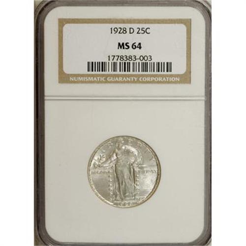 <B>1928-D 25C MS64 NGC.</B></I> NGC Census: (439/451). PCGS Population (701/570). Mintage: 1,627,600. Numismedia Wsl. Price for NGC/PCGS coin in MS64: $252. (#5768)<BR><BR><B>Coin Engraver:</B> Hermon A. MacNeil<BR><BR><b>Shipping:</b> Coins & Currency (<a target="_blank" href="http://www.heritageauctions.com/common/shipping.php">view shipping information</a>)