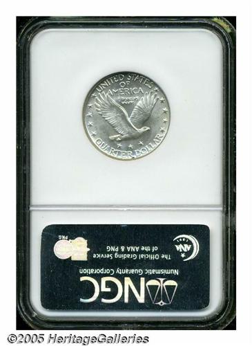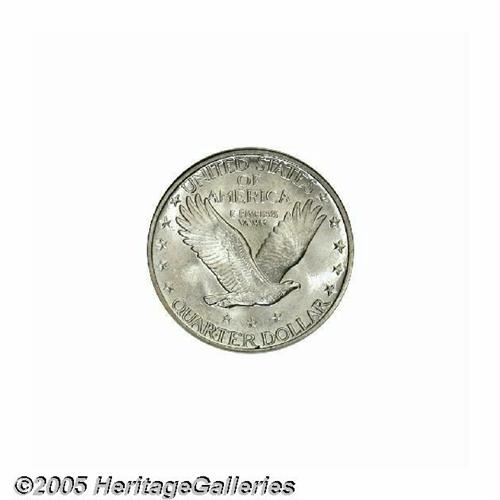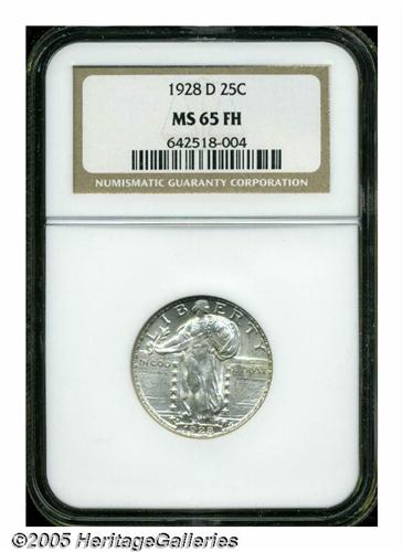 <B>1928-D<25C> MS65 Full Head NGC.</B></I> Even though 1.6 million pieces were produced, the 1928-D is surprisingly scarce with full striking definition on the head of Liberty, as seen on this example. The coin's other features are also boldly defined, and only a couple of shield rivets lack crisp definition. Lustrous surfaces display nearly imperceptible powder-blue and beige color. Minute contact marks on Liberty's neck and cheek and on the eagle's left wing are mentioned for accuracy. Population: 18 in 65, 10 finer (6/05).