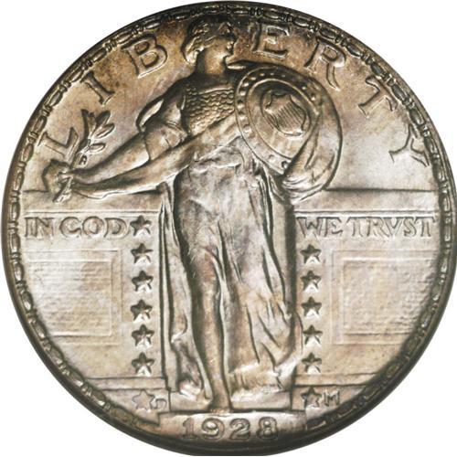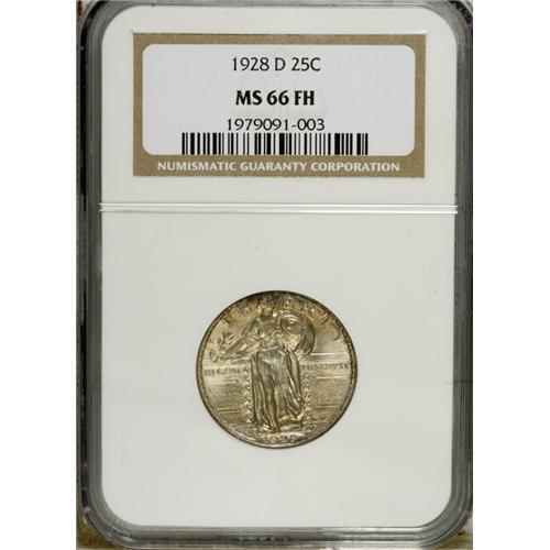 <B>1928-D 25C MS66 Full Head NGC.</B></I> Glints of pearl-gray and coral grace each side of this exemplary Premium Gem coin. The strike is pleasingly bold, save for the exception of the lowest star and the mintmark. Radiant luster emanates from the pristine surfaces, and the eye appeal is high. An elusive issue in MS66 Full Head, the 1928-D has a population of only 11 pieces so graded at NGC, with one coin finer, while there are 15 at PCGS, and two finer (1/07).<BR><BR><b>Shipping:</b> Coins & Currency (<a target="_blank" href="http://www.heritageauctions.com/common/shipping.php">view shipping information</a>)